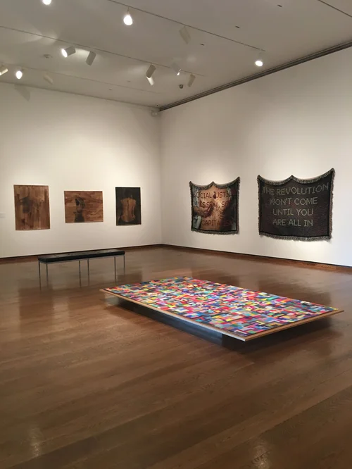 Installation shot of Presence #2 and #3, and Non-Hierarchy Means You Have to Take Turns on Top from "Slogans from the Revolution that Never Was," part of Seen and Heard at the Everson Museum, Syracuse NY. June 10 – August 29, 2017.
