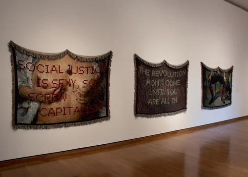 Installation shot of Absence 1, 2, and 3 , Social Justice is Sexy, Revolution Won't Come and Free Pussy from "Slogans from the Revolution that never was" part of Seem and Heard at the Everson Museum, Syracuse NY. June 10- August 29, 2017