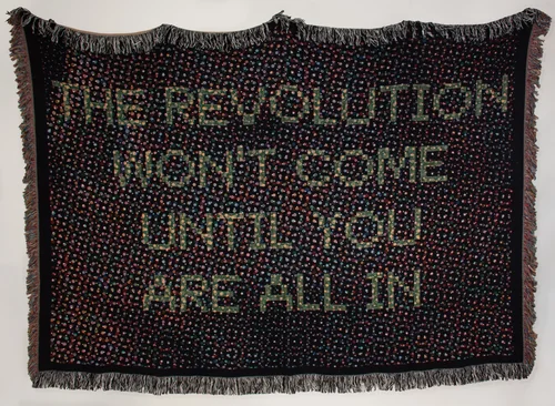 In producing agitprop that references the domestic — blankets, pillows, napkins, drawings that both employ and deploy the language of cross stitch, and quilts — Beltré questions what working toward an equitable society looks like in the midst of daily life. Political participation often means taking to the streets, but Beltré is interested in how that happens in the intimate space of the home and the heart.